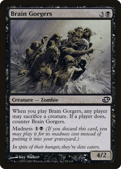When you cast this spell, any player may sacrifice a creature of their choice. If a player does, counter Brain Gorgers. Madness {1}{B} (If you discard this card, discard it into exile. When you do, cast it for its madness cost or put it into your graveyard.)
