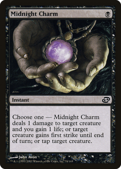 Choose one — • Midnight Charm deals 1 damage to target creature and you gain 1 life. • Target creature gains first strike until end of turn. • Tap target creature.