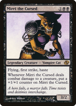 Flying, first strike, haste Whenever Mirri deals combat damage to a creature, put a +1/+1 counter on Mirri.