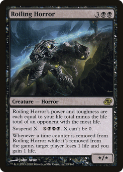 Roiling Horror's power and toughness are each equal to your life total minus the life total of an opponent with the most life. Suspend X—{X}{B}{B}{B}. X can't be 0. (Rather than cast this card from your hand, you may pay {X}{B}{B}{B} and exile it with X time counters on it. At the beginning of your upkeep, remove a time counter. When the last is removed, you may cast it without paying its mana cost. It has haste.) Whenever a time counter is removed from this card while it's exiled, target player loses 1 life and you gain 1 life.