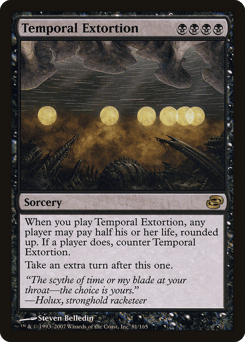 When you cast this spell, any player may pay half their life, rounded up. If a player does, counter Temporal Extortion. Take an extra turn after this one.