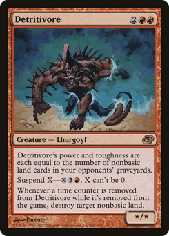 Detritivore's power and toughness are each equal to the number of nonbasic land cards in your opponents' graveyards. Suspend X—{X}{3}{R}. X can't be 0. (Rather than cast this card from your hand, you may pay {X}{3}{R} and exile it with X time counters on it. At the beginning of your upkeep, remove a time counter. When the last is removed, you may cast it without paying its mana cost. It has haste.) Whenever a time counter is removed from this card while it's exiled, destroy target nonbasic land.