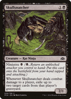Ninjutsu {B} ({B}, Return an unblocked attacker you control to hand: Put this card onto the battlefield from your hand tapped and attacking.) Whenever this creature deals combat damage to a player, exile up to two target cards from that player's graveyard.