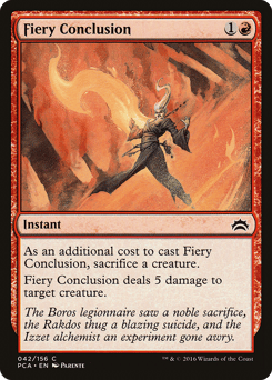 As an additional cost to cast this spell, sacrifice a creature. Fiery Conclusion deals 5 damage to target creature.