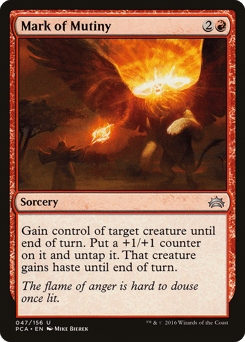Gain control of target creature until end of turn. Put a +1/+1 counter on it and untap it. That creature gains haste until end of turn. (It can attack and {T} this turn.)