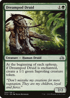 Whenever an Aura becomes attached to this creature, create two 1/1 green Saproling creature tokens.
