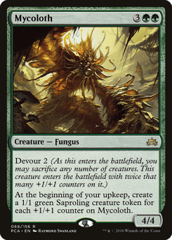 Devour 2 (As this creature enters, you may sacrifice any number of creatures. It enters with twice that many +1/+1 counters on it.) At the beginning of your upkeep, create a 1/1 green Saproling creature token for each +1/+1 counter on this creature.