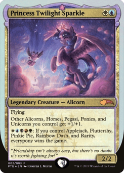 Flying Other Alicorns, Horses, Pegasi, Ponies, and Unicorns you control get +1/+1. {W}{U}{B}{R}{G}: If you control Applejack, Fluttershy, Pinkie Pie, Rainbow Dash, and Rarity, everypony wins the game.