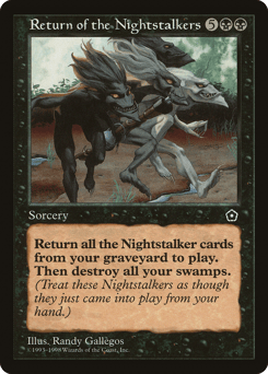 Return all Nightstalker permanent cards from your graveyard to the battlefield. Then destroy all Swamps you control.