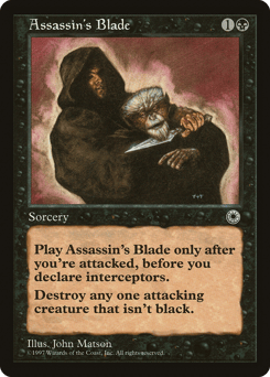 Cast this spell only during the declare attackers step and only if you've been attacked this step. Destroy target nonblack attacking creature.
