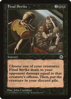 As an additional cost to cast this spell, sacrifice a creature. Final Strike deals damage to target opponent or planeswalker equal to the sacrificed creature's power.
