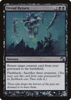 Return target creature card from your graveyard to the battlefield. Flashback—Sacrifice three creatures. (You may cast this card from your graveyard for its flashback cost. Then exile it.)