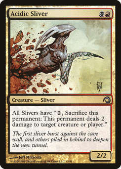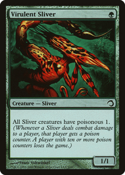All Sliver creatures have poisonous 1. (Whenever a Sliver deals combat damage to a player, that player gets a poison counter. A player with ten or more poison counters loses the game.)