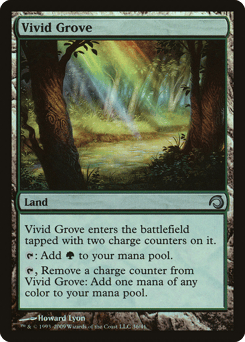 This land enters tapped with two charge counters on it. {T}: Add {G}. {T}, Remove a charge counter from this land: Add one mana of any color.