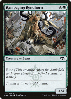 Riot (This creature enters with your choice of a +1/+1 counter or haste.) Menace (This creature can't be blocked except by two or more creatures.)