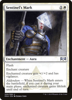 Flash Enchant creature Enchanted creature gets +1/+2 and has vigilance. Addendum — When this Aura enters, if you cast it during your main phase, enchanted creature gains lifelink until end of turn.