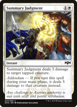 Summary Judgment deals 3 damage to target tapped creature. Addendum — If you cast this spell during your main phase, it deals 5 damage instead.