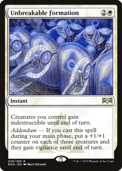 Creatures you control gain indestructible until end of turn. Addendum — If you cast this spell during your main phase, put a +1/+1 counter on each of those creatures and they gain vigilance until end of turn.