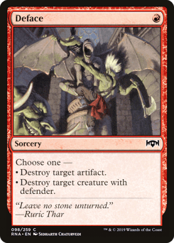 Choose one — • Destroy target artifact. • Destroy target creature with defender.