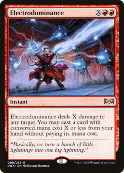 Electrodominance deals X damage to any target. You may cast a spell with mana value X or less from your hand without paying its mana cost.