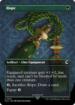 Equipped creature gets +1/+2, has reach, and can't be blocked by more than one creature. {2}, Sacrifice this Equipment: Draw a card. Equip {3}