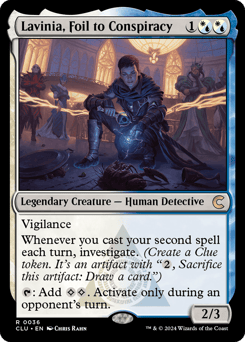 Vigilance Whenever you cast your second spell each turn, investigate. (Create a Clue token. It's an artifact with "{2}, Sacrifice this token: Draw a card.") {T}: Add {C}{C}. Activate only during an opponent's turn.