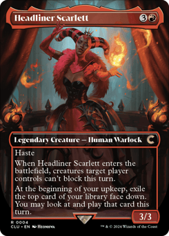 Haste When Headliner Scarlett enters, creatures target player controls can't block this turn. At the beginning of your upkeep, exile the top card of your library face down. You may look at and play that card this turn.