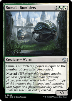 Sumala Rumblers's power is equal to the number of creatures you control. Myriad (Whenever this creature attacks, for each opponent other than defending player, you may create a token copy that's tapped and attacking that player or a planeswalker they control. Exile the tokens at end of combat.)