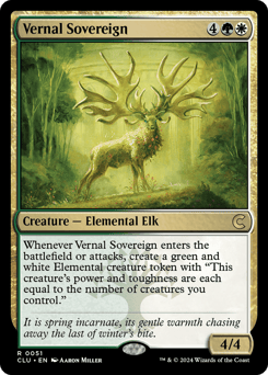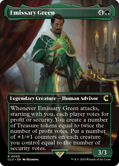 Whenever Emissary Green attacks, starting with you, each player votes for profit or security. You create a number of Treasure tokens equal to twice the number of profit votes. Put a number of +1/+1 counters on each creature you control equal to the number of security votes.