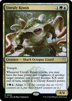 Trample Whenever this creature attacks, you may have the base power and toughness of another target creature you control become X/X until end of turn, where X is this creature's power. {3}{G}{U}: Adapt 3. (If this creature has no +1/+1 counters on it, put three +1/+1 counters on it.)