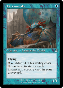 Flying {7}{U}: Adapt 4. This ability costs {1} less to activate for each instant and sorcery card in your graveyard. (If this creature has no +1/+1 counters on it, put four +1/+1 counters on it.)
