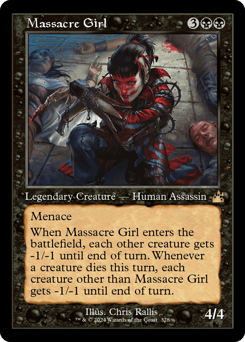 Menace When Massacre Girl enters, each other creature gets -1/-1 until end of turn. Whenever a creature dies this turn, each creature other than Massacre Girl gets -1/-1 until end of turn.