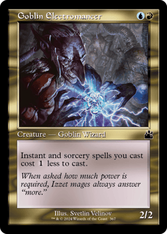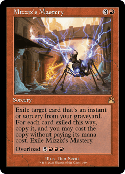 Exile target card that's an instant or sorcery from your graveyard. For each card exiled this way, copy it, and you may cast the copy without paying its mana cost. Exile Mizzix's Mastery. Overload {5}{R}{R}{R} (You may cast this spell for its overload cost. If you do, change "target" in its text to "each.")
