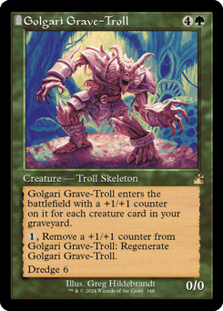 This creature enters with a +1/+1 counter on it for each creature card in your graveyard. {1}, Remove a +1/+1 counter from this creature: Regenerate this creature. Dredge 6 (If you would draw a card, you may mill six cards instead. If you do, return this card from your graveyard to your hand.)