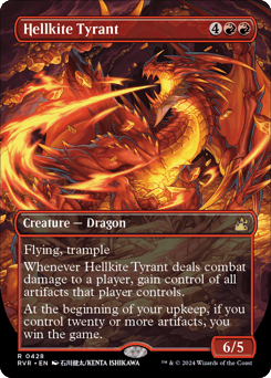 Flying, trample Whenever Hellkite Tyrant deals combat damage to a player, gain control of all artifacts that player controls. At the beginning of your upkeep, if you control twenty or more artifacts, you win the game.