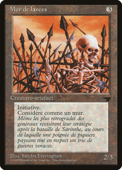 Wall creatures you control get +1/+0 and have banding. (Any creatures with banding, and up to one without, can attack in a band. Bands are blocked as a group. If any creatures with banding you control are blocking or being blocked by a creature, you divide that creature's combat damage, not its controller, among any of the creatures it's being blocked by or is blocking.)