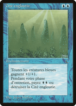 Trample This creature enters tapped and doesn't untap during your untap step. At the beginning of your upkeep, you may sacrifice two Islands. If you do, untap this creature. This creature can't attack unless you sacrifice two Islands. (This cost is paid as attackers are declared.)