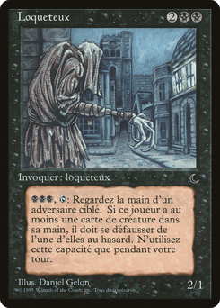 {B}{B}{B}, {T}: Target opponent reveals their hand and discards a creature card at random. Activate only during your turn.