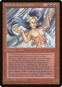 Remove this card from your deck before playing if you're not playing for ante. {T}, Sacrifice this creature: Target opponent may pay 10 life. If that player doesn't, they reveal a card at random from their hand. Exchange ownership of the revealed card and Tempest Efreet. Put the revealed card into your hand and Tempest Efreet from anywhere into that player's graveyard. This change in ownership is permanent.