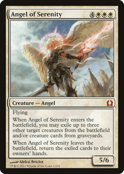 Flying When this creature enters, you may exile up to three other target creatures from the battlefield and/or creature cards from graveyards. When this creature leaves the battlefield, return the exiled cards to their owners' hands.