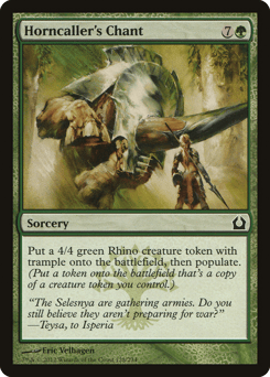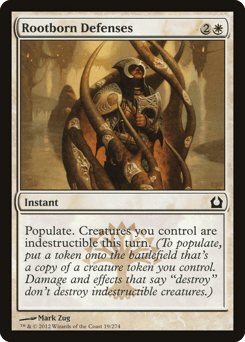 Populate. Creatures you control gain indestructible until end of turn. (To populate, create a token that's a copy of a creature token you control.)