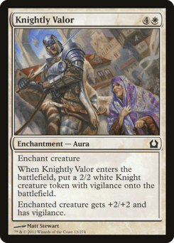 Enchant creature When this Aura enters, create a 2/2 white Knight creature token with vigilance. (Attacking doesn't cause it to tap.) Enchanted creature gets +2/+2 and has vigilance.