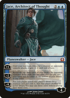 [+1]: Until your next turn, whenever a creature an opponent controls attacks, it gets -1/-0 until end of turn. [−2]: Reveal the top three cards of your library. An opponent separates those cards into two piles. Put one pile into your hand and the other on the bottom of your library in any order. [−8]: For each player, search that player's library for a nonland card and exile it, then that player shuffles. You may cast those cards without paying their mana costs.