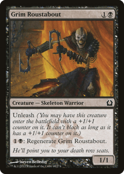 Unleash (You may have this creature enter with a +1/+1 counter on it. It can't block as long as it has a +1/+1 counter on it.) {1}{B}: Regenerate this creature.