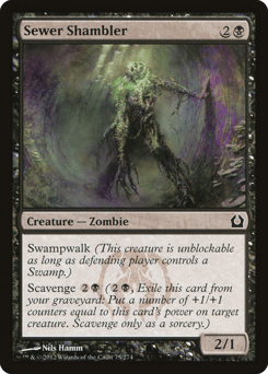 Swampwalk (This creature can't be blocked as long as defending player controls a Swamp.) Scavenge {2}{B} ({2}{B}, Exile this card from your graveyard: Put a number of +1/+1 counters equal to this card's power on target creature. Scavenge only as a sorcery.)