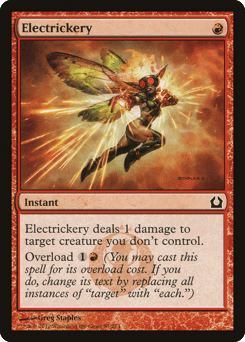 Electrickery deals 1 damage to target creature you don't control. Overload {1}{R} (You may cast this spell for its overload cost. If you do, change "target" in its text to "each.")