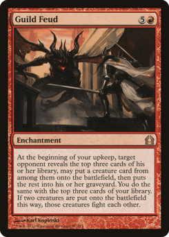 At the beginning of your upkeep, target opponent reveals the top three cards of their library, may put a creature card from among them onto the battlefield, then puts the rest into their graveyard. You do the same with the top three cards of your library. If two creatures are put onto the battlefield this way, those creatures fight each other.