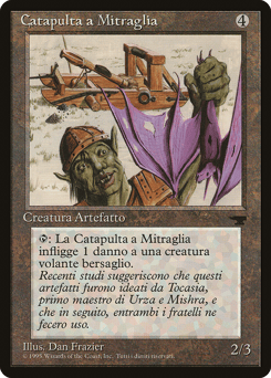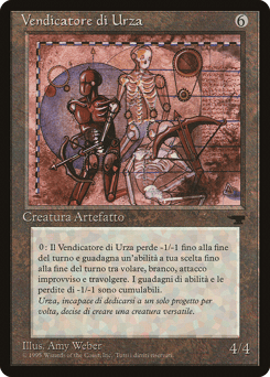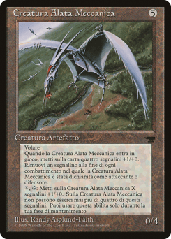 Flying (This creature can't be blocked except by creatures with flying or reach.) First strike (This creature deals combat damage before creatures without first strike.) At the beginning of your upkeep, you may sacrifice an artifact. If you don't, tap this creature and it deals 2 damage to you.