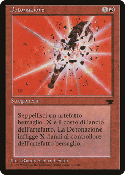 Destroy target artifact with mana value X. It can't be regenerated. Detonate deals X damage to that artifact's controller.