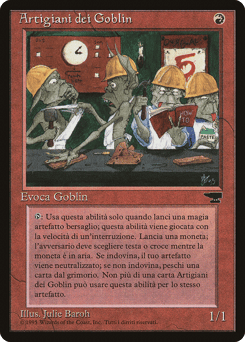 {T}: Flip a coin. If you win the flip, draw a card. If you lose the flip, counter target artifact spell you control that isn't the target of an ability from another creature named Goblin Artisans.